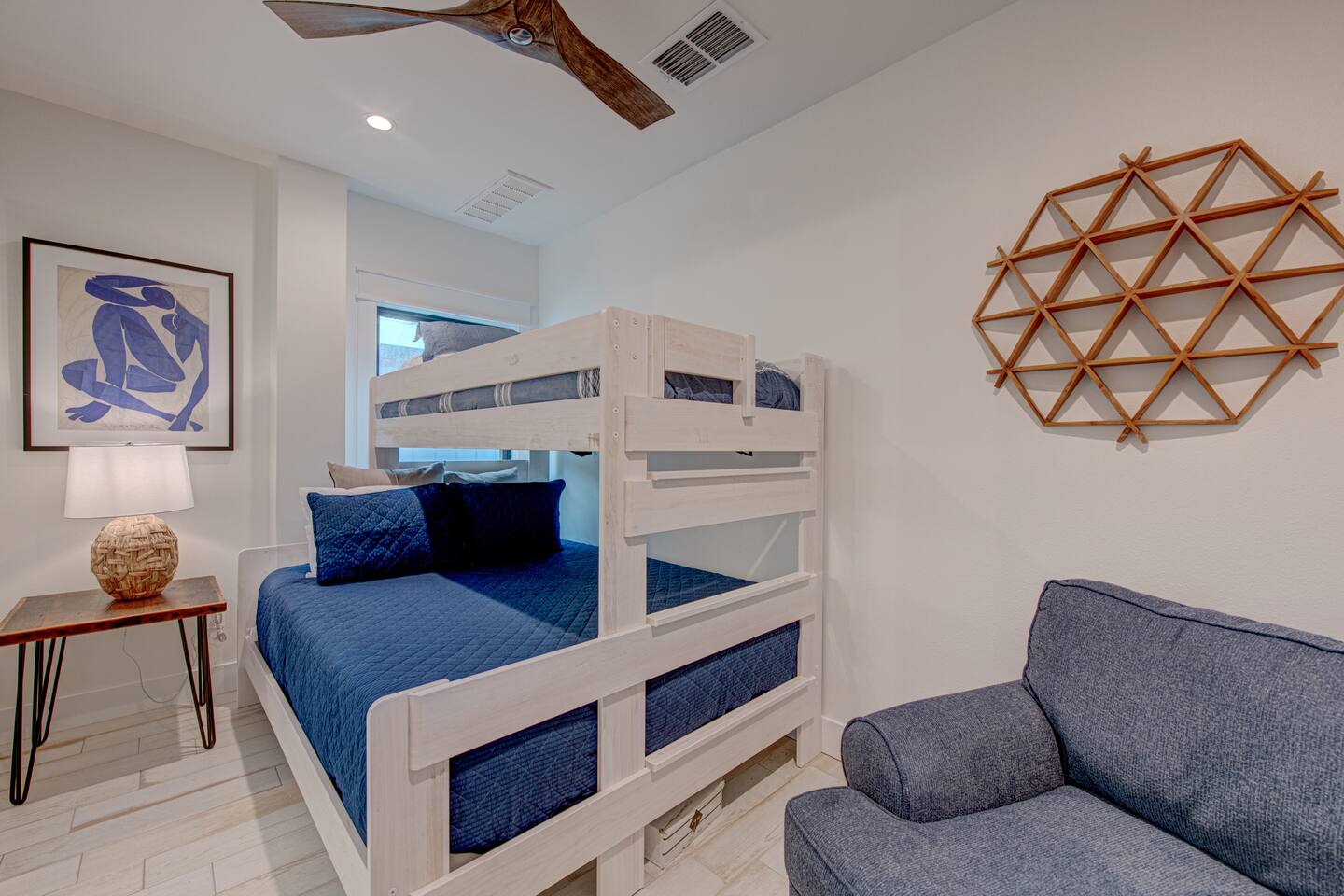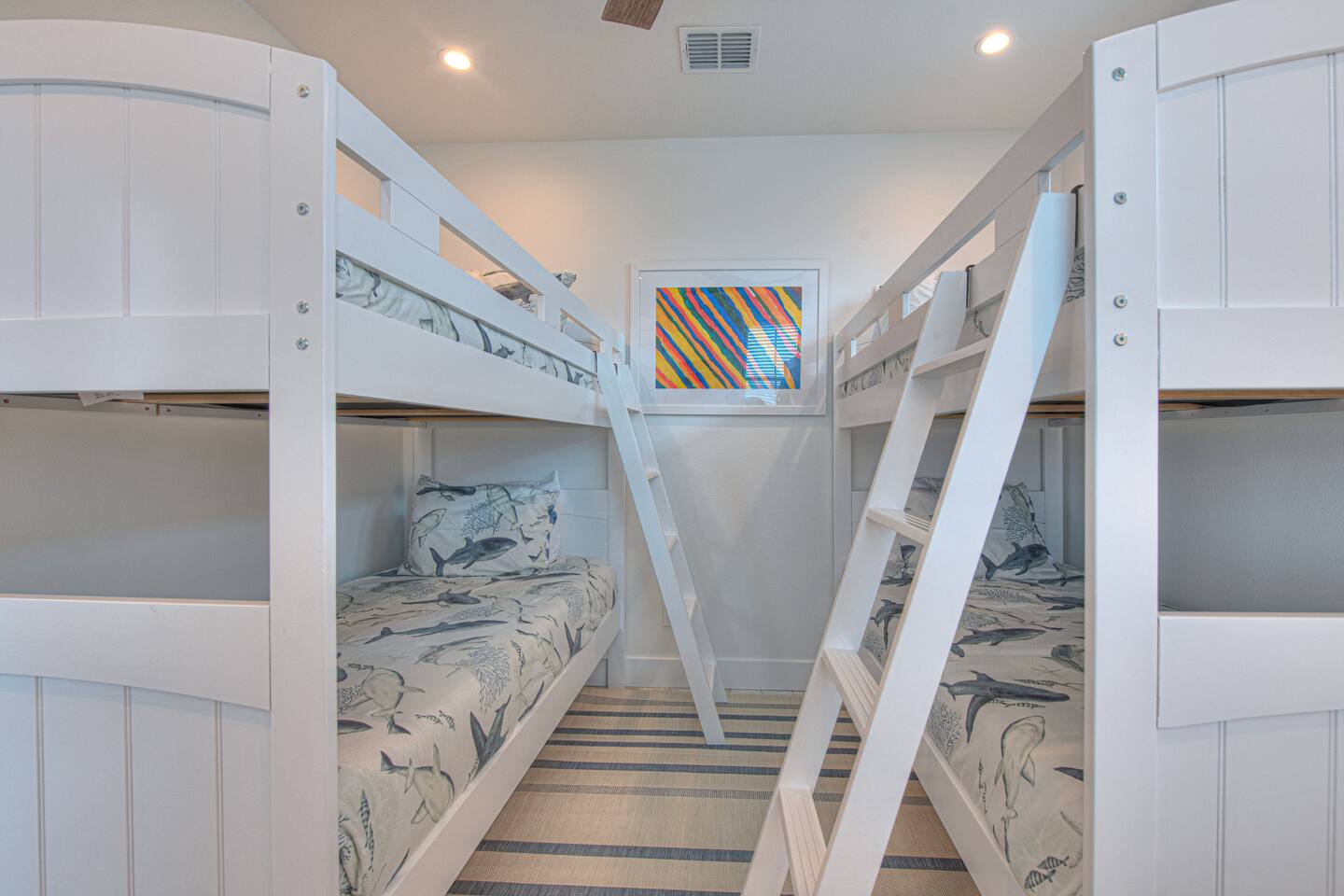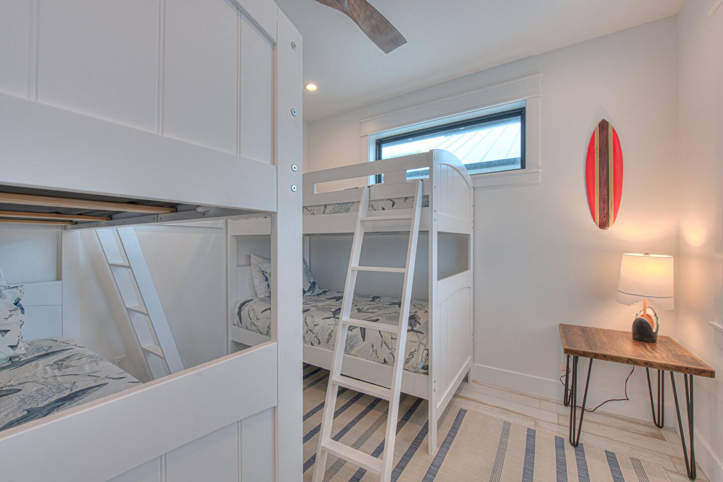 The front door to the house is located on the 2nd floor. The main living area, and kitchen are on the 2nd as well as two king bedrooms and two bathrooms. The 3rd floor has the double bunk room and an additional bathroom. The 5th bedroom with a single bed over a double style bunkbed is located downstairs, separated from the rest of the house with its own bathroom and the laundry room. There is enough parking to accommodate up to 5 cars.
