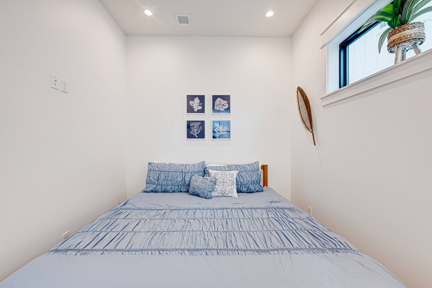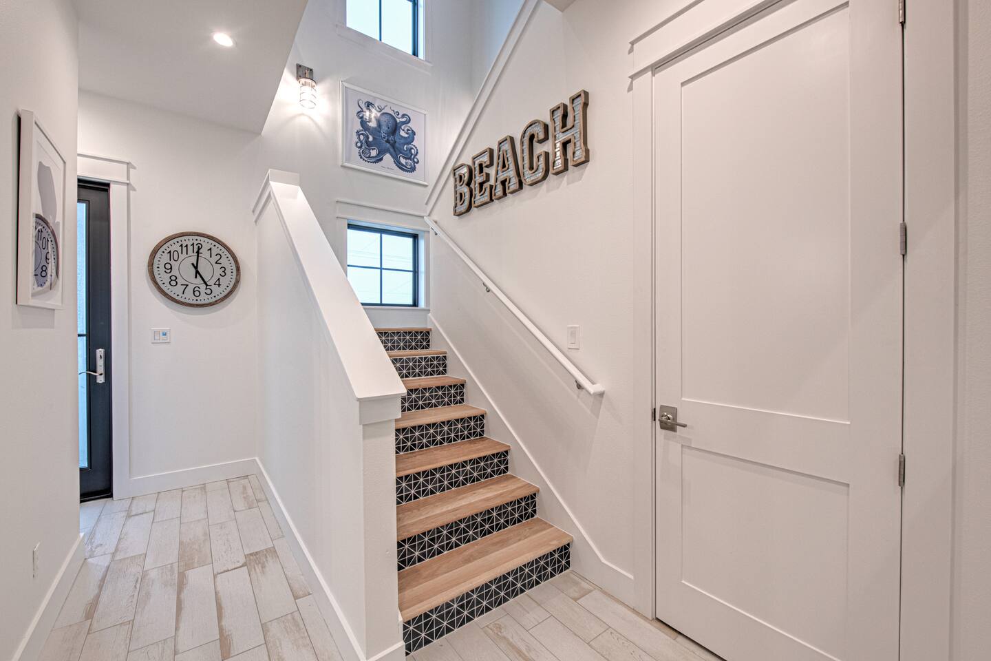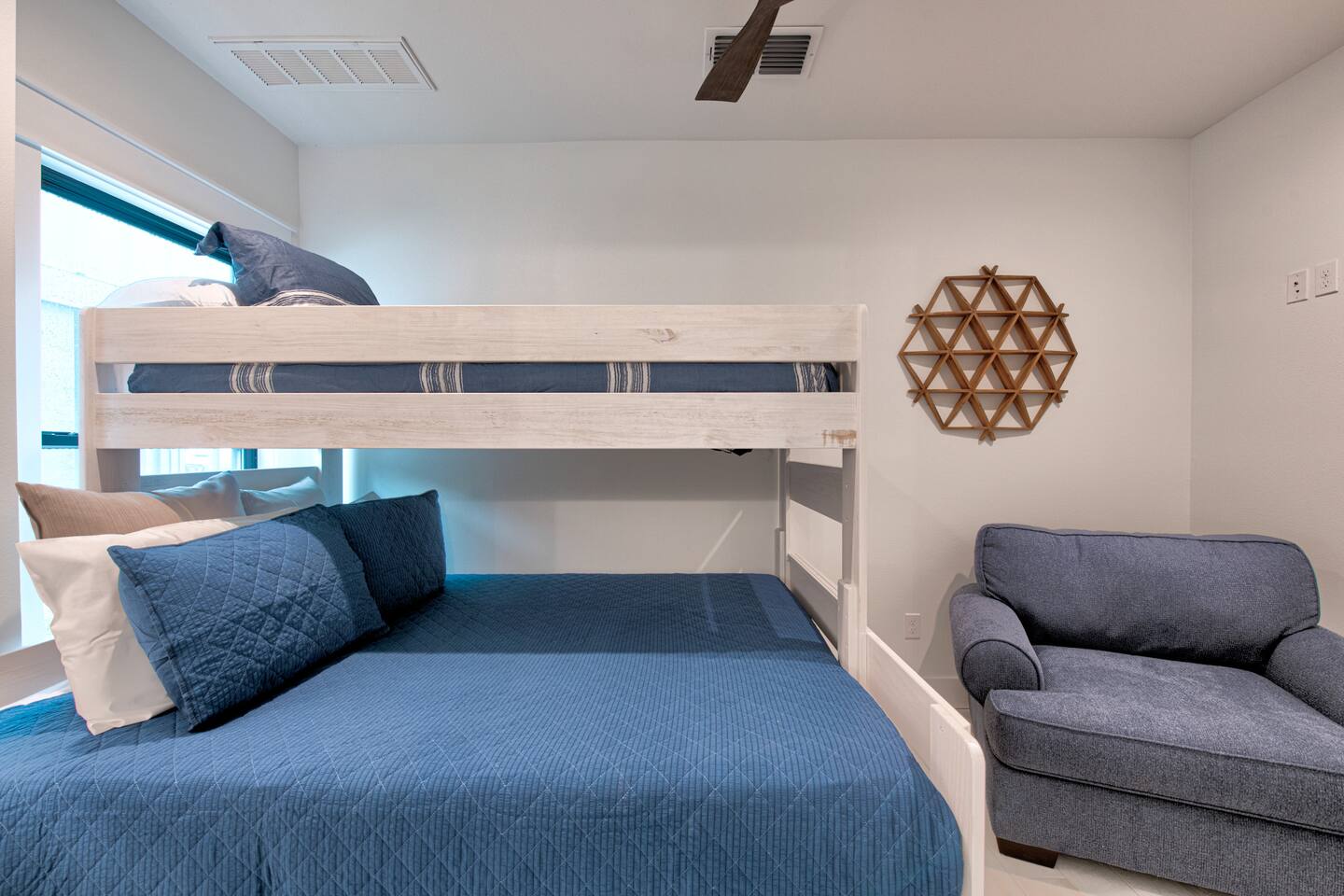 The front door to the house is located on the 2nd floor. The main living area, and kitchen are on the 2nd as well as two king bedrooms and two bathrooms. The 3rd floor has the double bunk room and an additional bathroom. The 5th bedroom with a single bed over a double style bunkbed is located downstairs, separated from the rest of the house with its own bathroom and the laundry room. There is enough parking to accommodate up to 5 cars.
